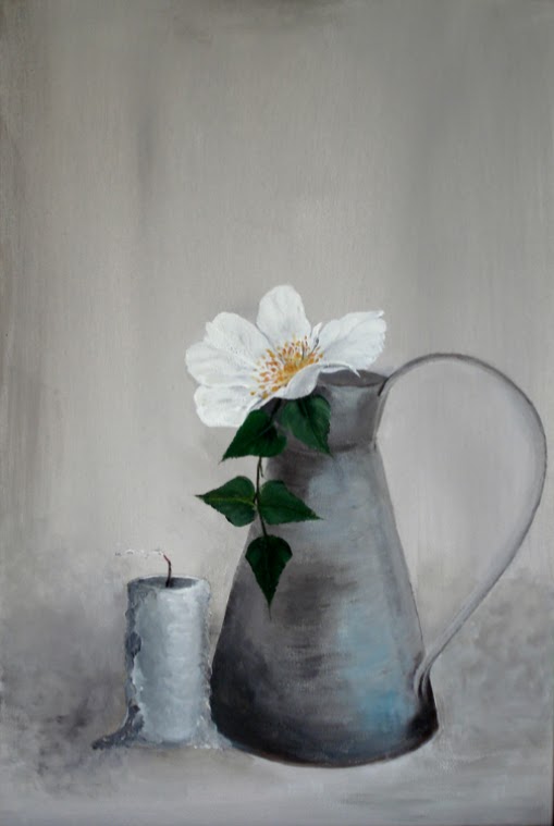 Een oude gietijzeren kan, een kaars en een roos (Rosa Nevada).
